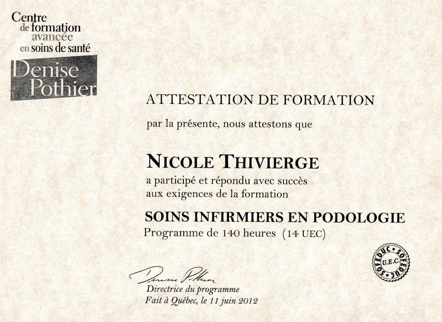 Je suis infirmière auxiliaire, diplômée en podologie depuis juin 2012. J’offre des soins à domicile, en RPA et en CHSLD. Douce et attentionnée, je travaille exclusivement avec des instruments stériles.